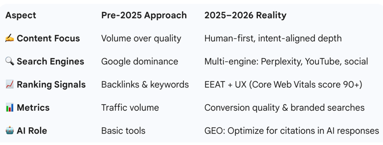 SEO is changing fast, moving away from just pumping out content to focus on high-quality, human-first depth. Instead of just chasing Google rankings with keywords, the goal now is to build real authority (EEAT) and ensure your site is fast enough—ideally under 2.5 seconds—to keep people from leaving. With more people using AI like Perplexity and searching on YouTube or social media, you have to optimize for multiple platforms and aim for quality conversions rather than just raw traffic. For startups, this means treating SEO as a growth engine that builds brand trust across the entire buyer journey.